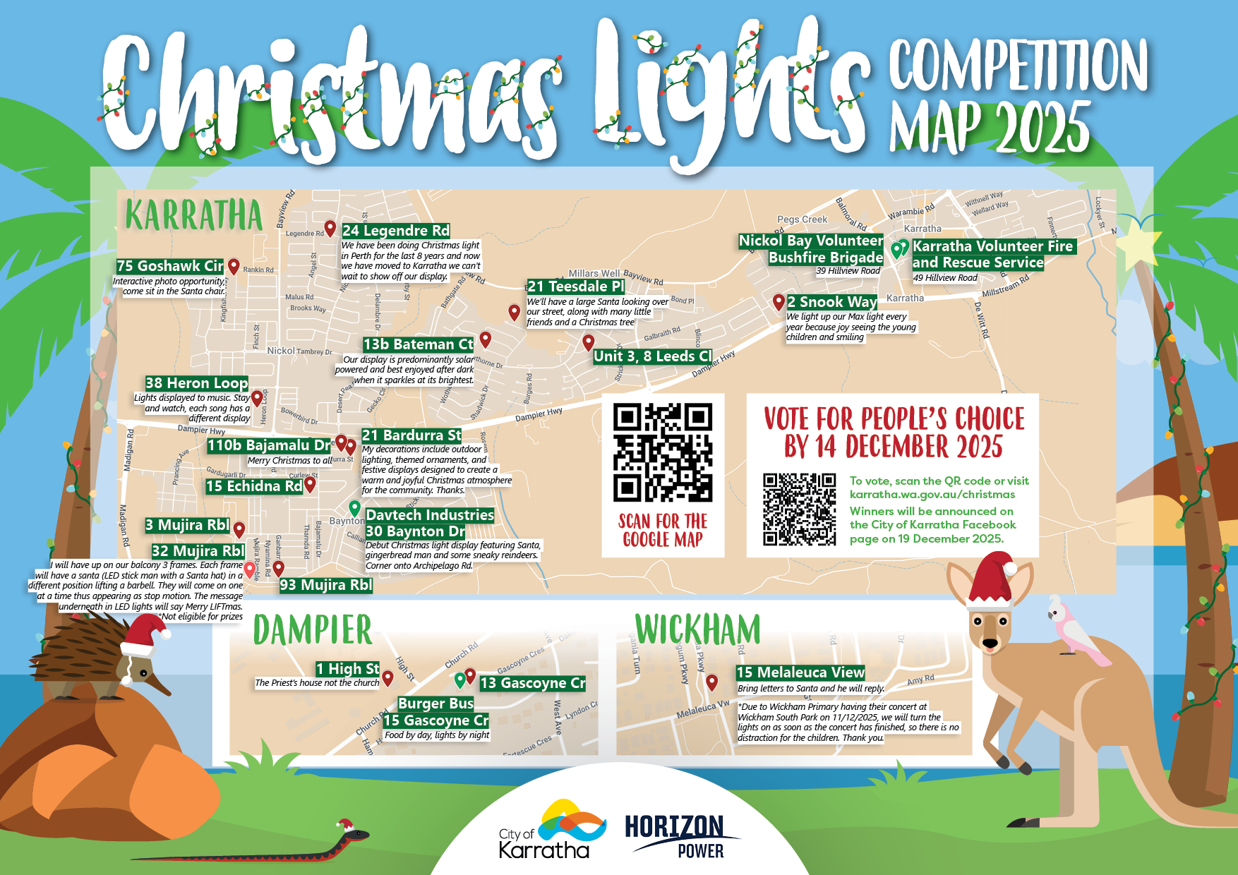 - The People’s Choice Prize will be judged by the community via our online voting poll (karratha.wa.gov.au/Christmas) or by scanning the QR code provided at each household and business.