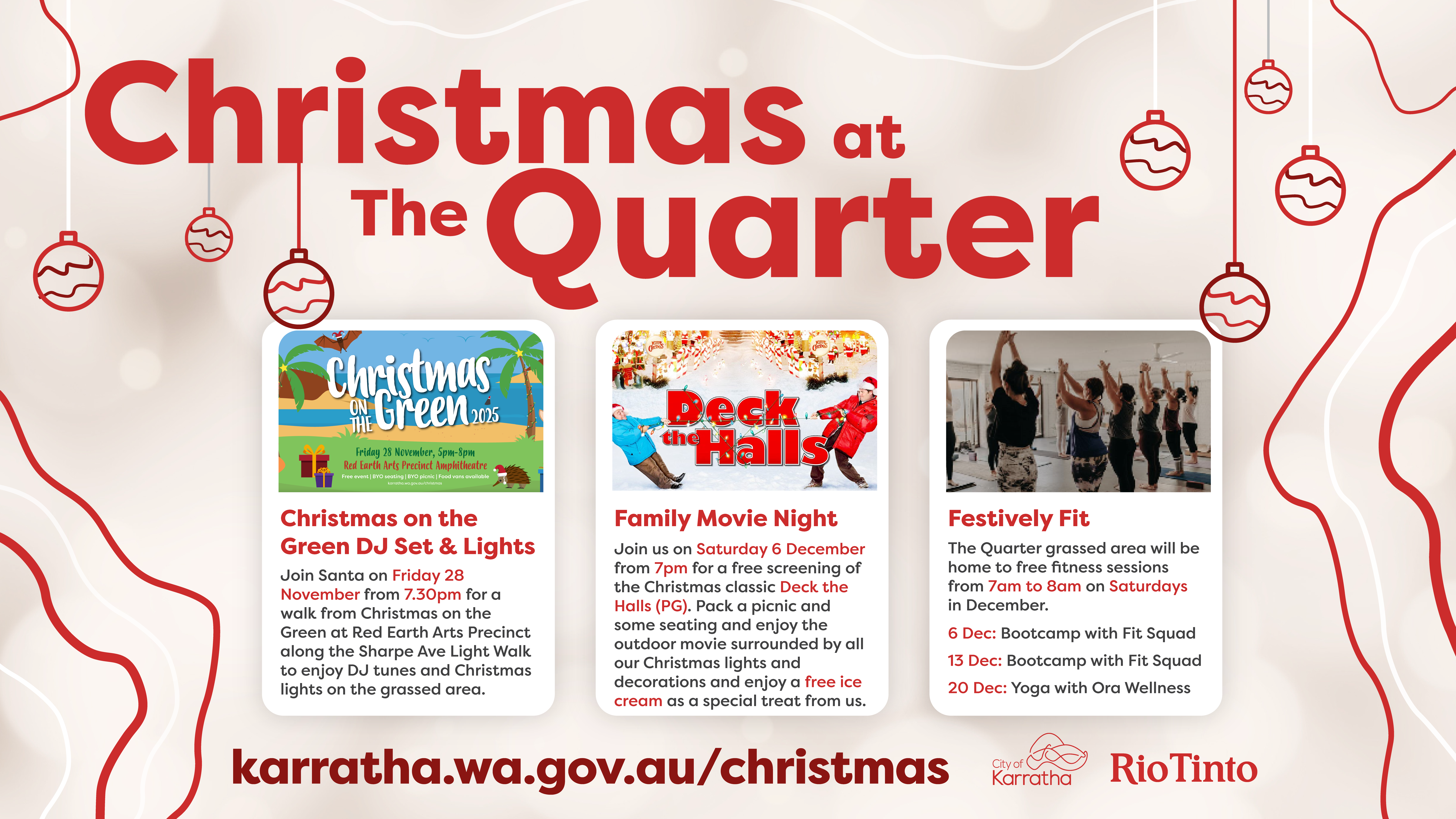 Free Bootcamp and Yoga sessions on the grass at The QuarterThe Quarter grassed area will be home to free fitness sessions from 7am to 8am on Saturdays in December. 6 Dec: Bootcamp with Fit Squad 13 Dec: Bootcamp with Fit Squad20 Dec: Yoga with Ora Wellness