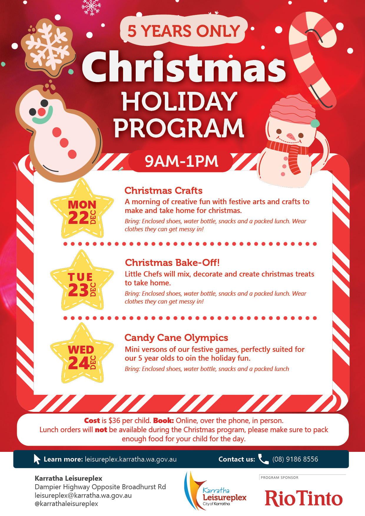 Tue 23 Dec – Christmas Bake-Off: Little chefs will mix, decorate, and create Christmas treats to take home.