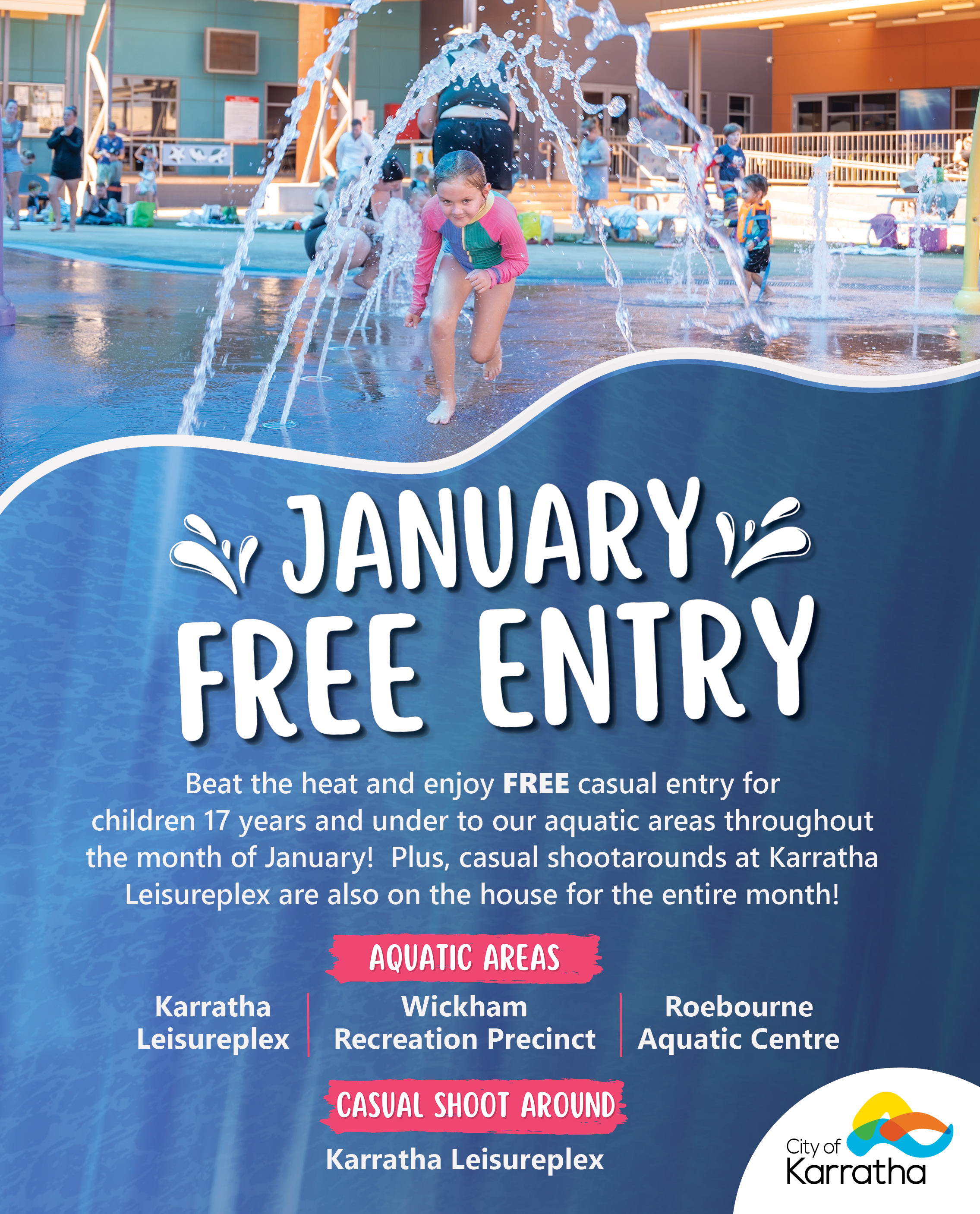 Make a splash this summer with free fun for the whole month of January. Children aged 17 years and under can enjoy FREE casual entry to our aquatic areas all month long, the perfect way to cool off and stay active!
