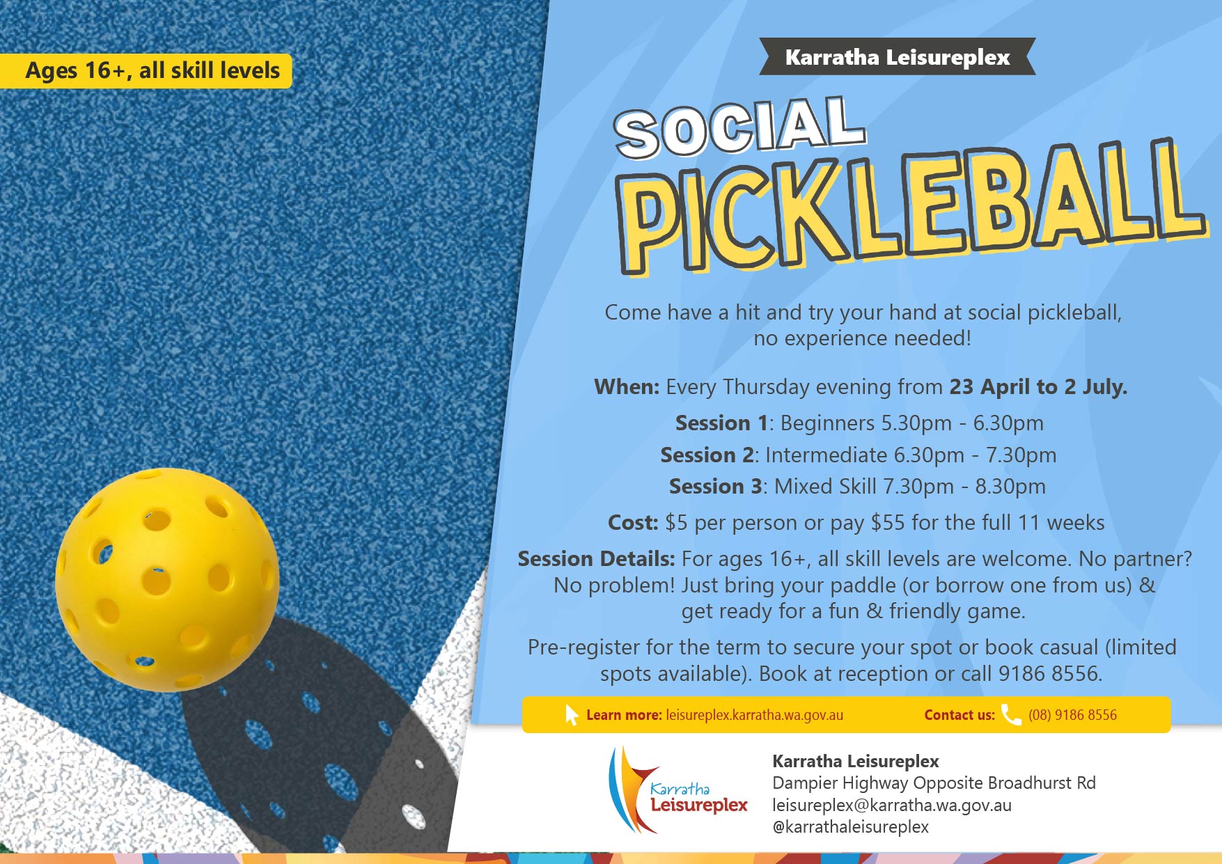 Get active, have fun and meet new people with Social Pickleball at Karratha Leisureplex!