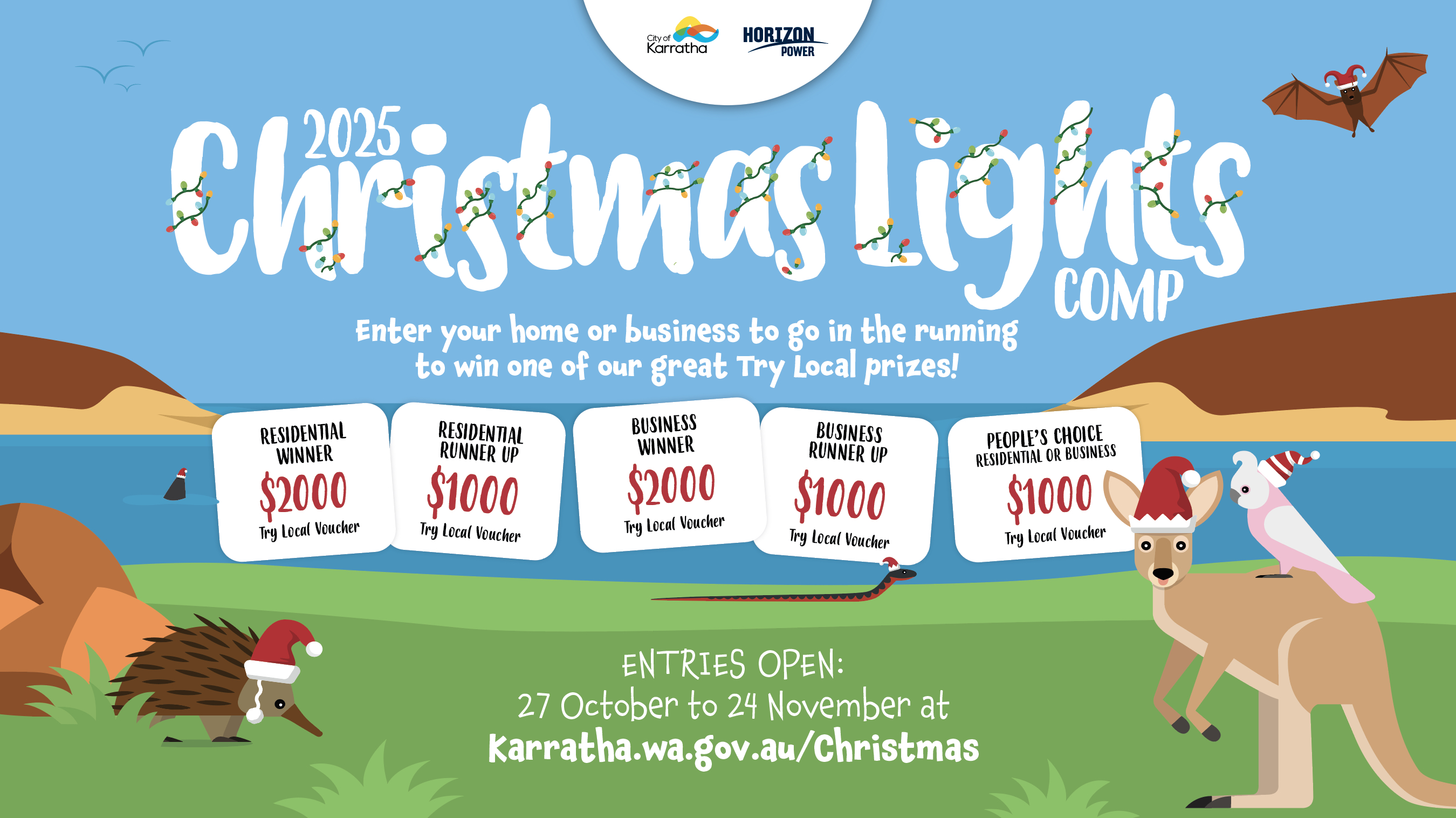 - By submitting an online entry, you agree to the following terms and conditions of the 2025 City of Karratha Christmas Lights Competition sponsored by Horizon Power.
