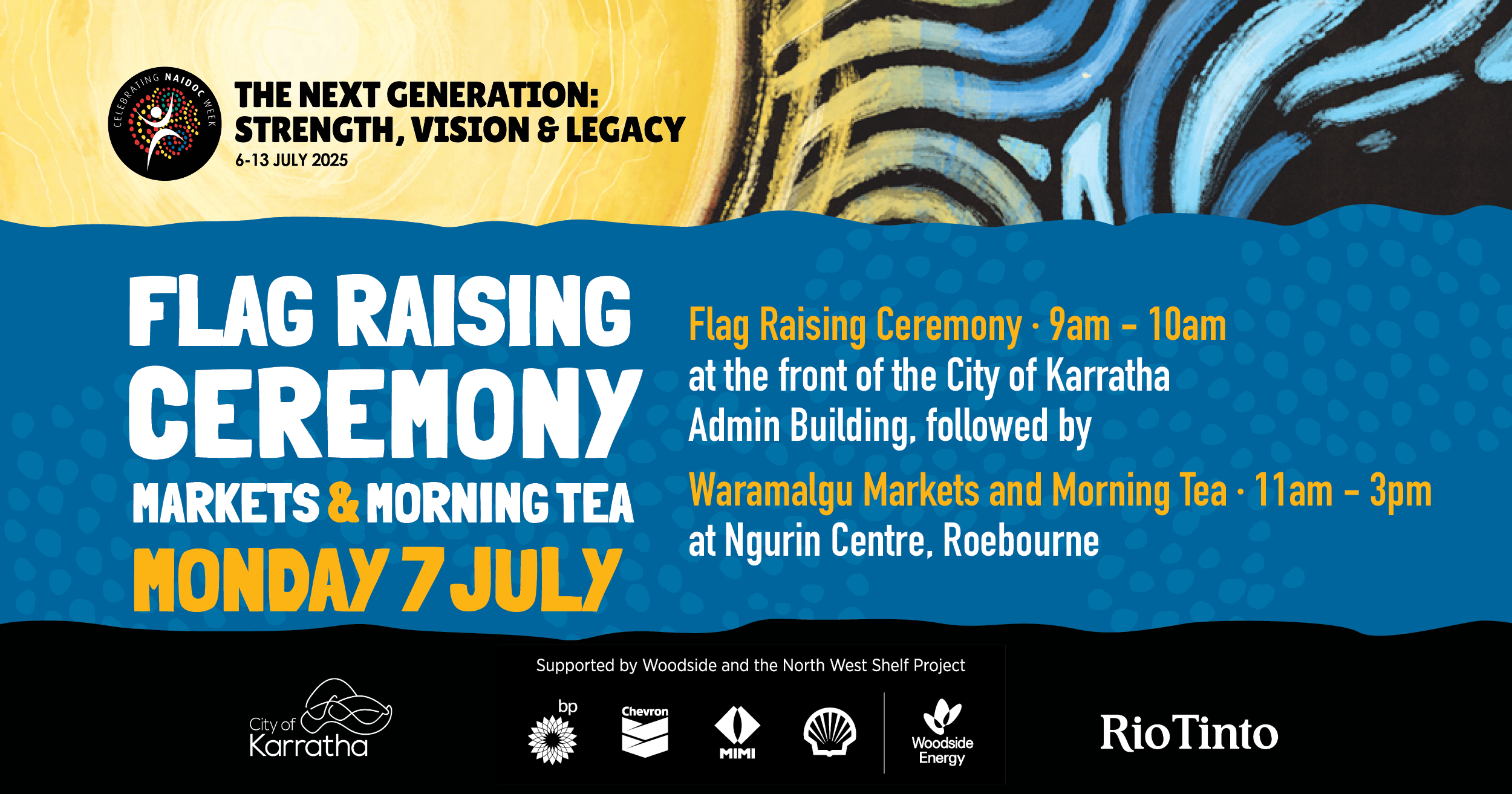 The Flag Raising Ceremony will take place on Monday 7 July, from 9am to 10am, at the front of the City of Karratha Administration Building. The ceremony recognises the importance of NAIDOC Week in honouring the history, culture, and achievements of Aboriginal and Torres Strait Islander peoples.