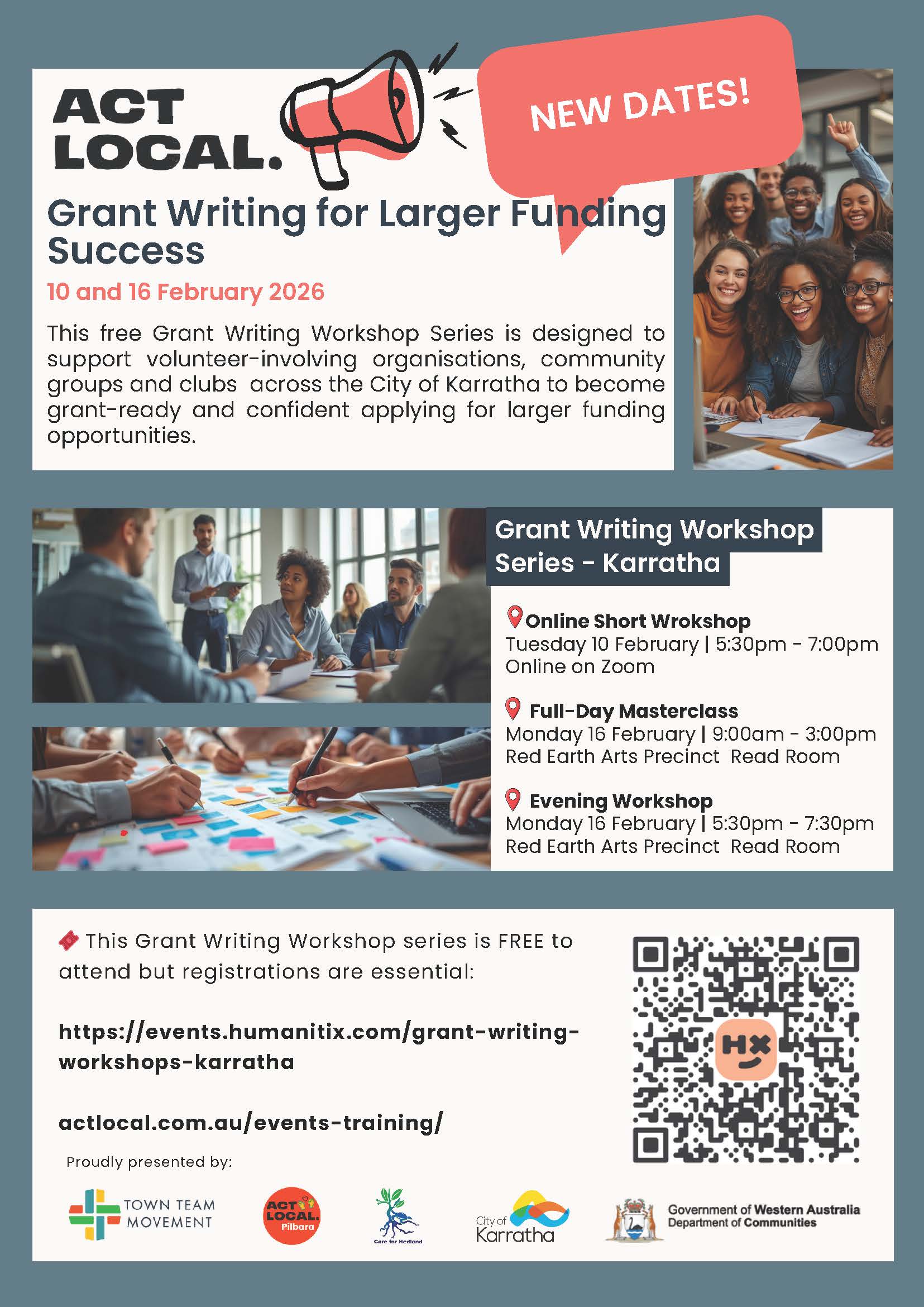 Even if you registered previously, we kindly ask everyone to register again for the new sessions via Humanitix: https://events.humanitix.com/grant-writing-workshops-karratha