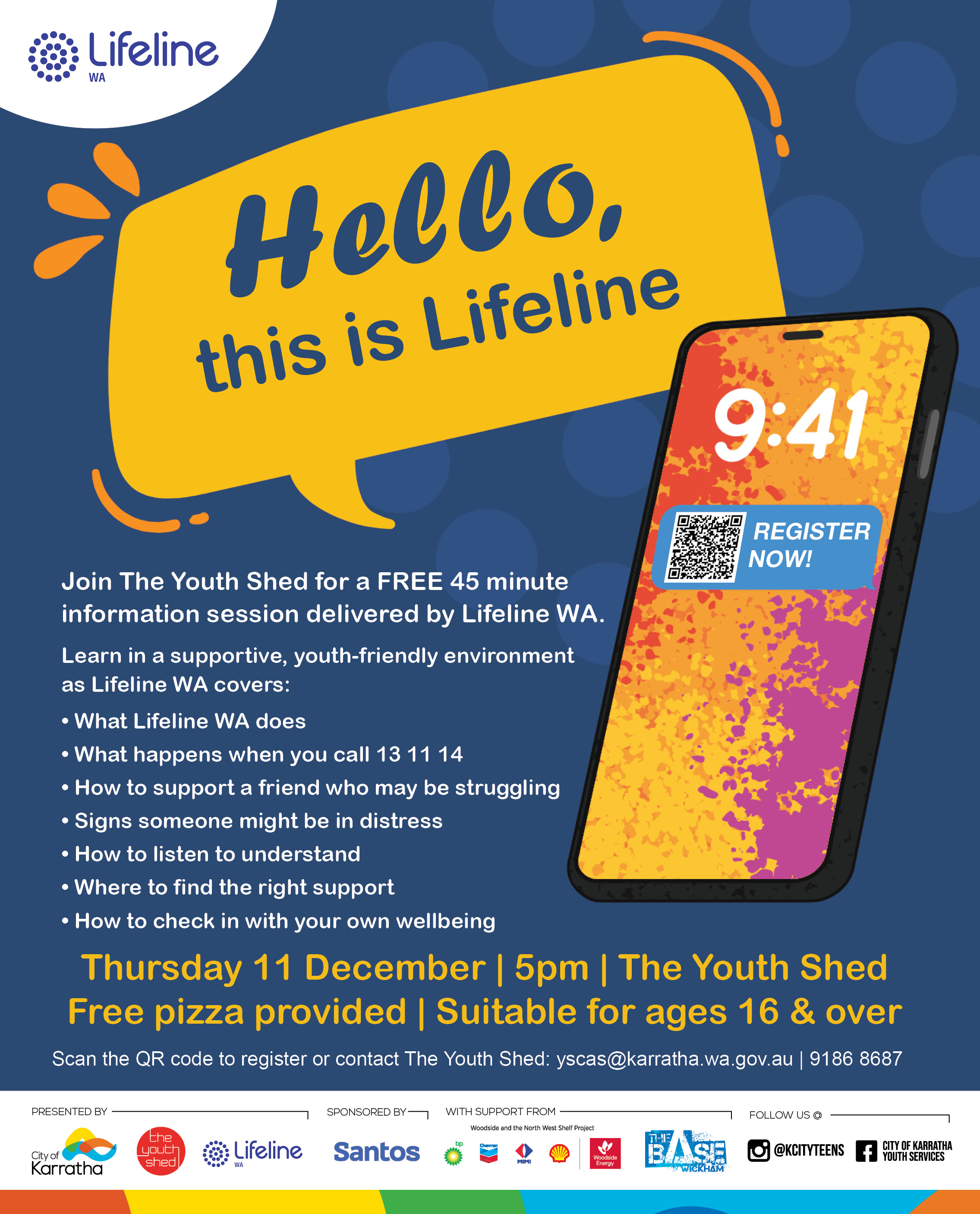 Join The Youth Shed for a 45-minute, youth-friendly information session delivered by Lifeline WA, designed to build confidence and awareness around supporting yourself and others.
