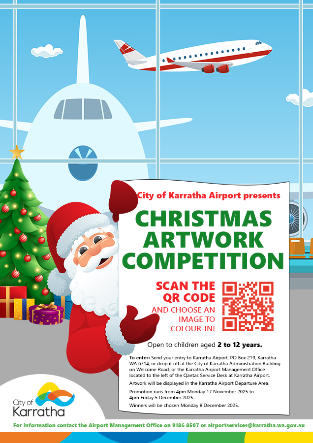 The City of Karratha Airport is calling on local children aged 2 to 12 years to take part in our annual Christmas Artwork Competition. Simply download your favourite festive-themed colouring page, complete your masterpiece, and send it in for a chance to have your artwork displayed at the Karratha Airport Departure Area this Christmas!