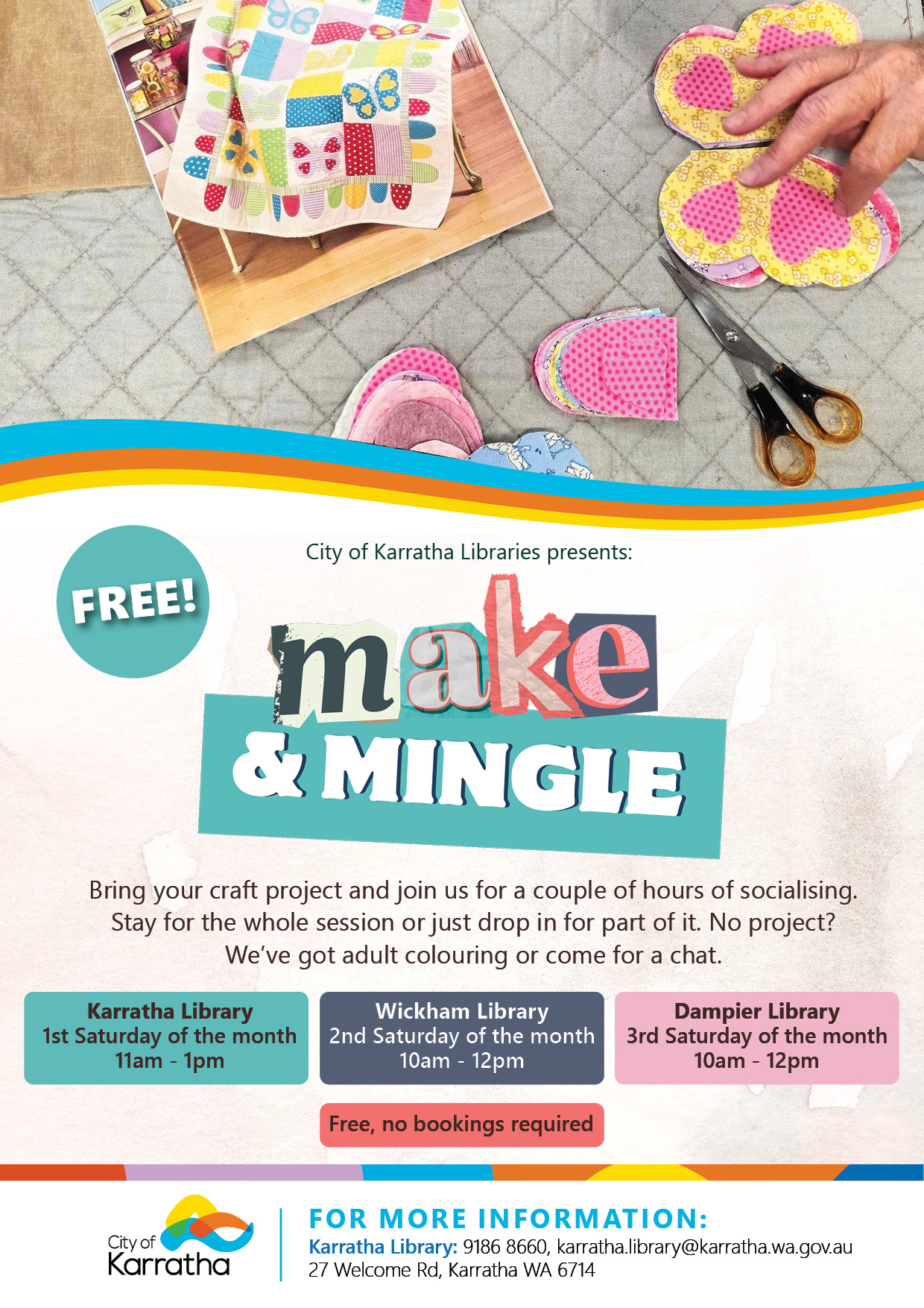 Add to Calendar 2026-02-01 03:00:00 2026-02-01 03:00:00 Make & Mingle Make & MingleLooking for a relaxed way to get creative and meet new people? Make & Mingle is a free, social crafting session for adults at City of Karratha Libraries.Bring along your own craft project or simply drop in and enjoy adult colouring, conversation and a friendly atmosphere. Stay for the whole session or just pop in for part of it, there’s no pressure and no experience needed.- A welcoming, social space- Bring-your-own craft projects or provided activities- Adult colouring available- Come to create, chat or just unwindKarratha Library: 1st Saturday of the month | 11am–1pmWickham Library: 2nd Saturday of the month | 10am–12pmDampier Library: 3rd Saturday of the month | 10am–12pm- Free to attend, no bookings required.  POINT (116.8346097 -20.7344231) Australia/Sydney public