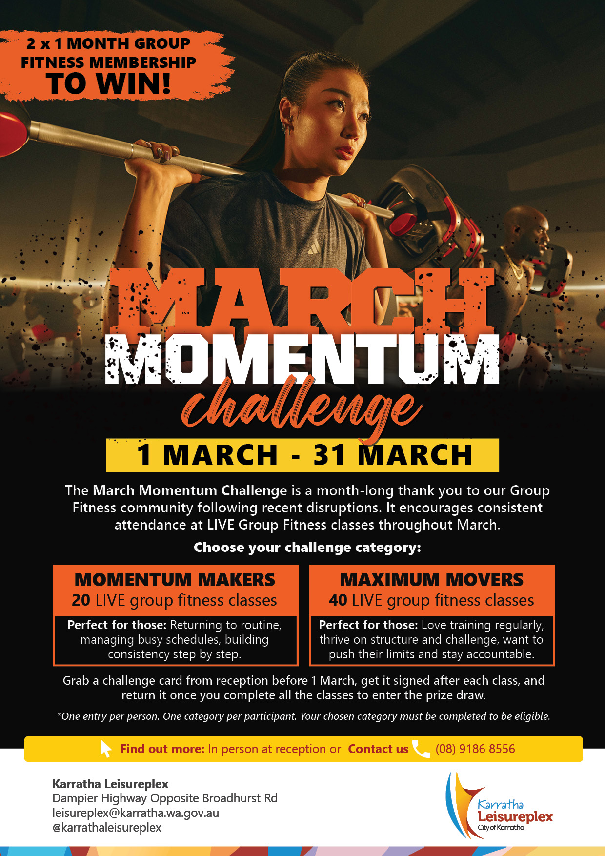 The March Momentum Challenge is a month-long thank you to our Group Fitness community following recent disruptions. It’s all about rebuilding routine, staying motivated, and celebrating consistency, at a pace that works for you.