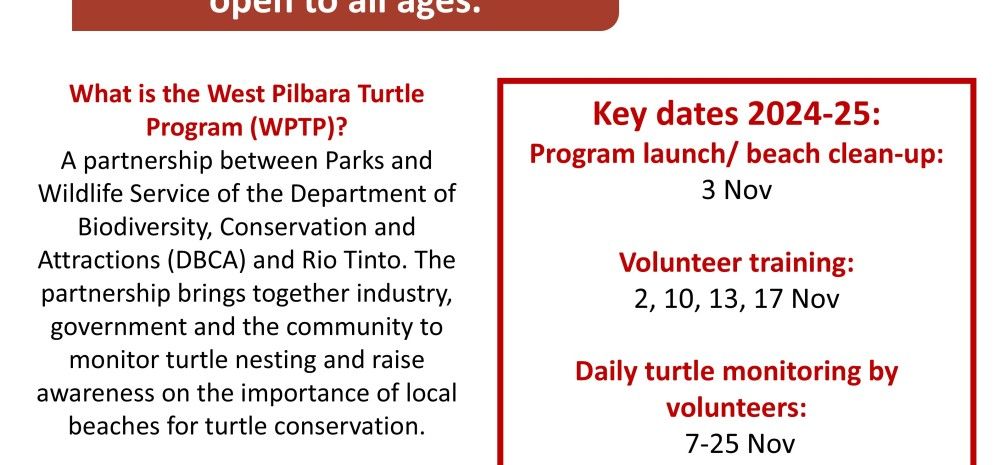 The West Pilbara Turtle Program is a partnership between Parks and Wildlife Service and Rio Tinto. Each year, community volunteers monitor turtle nesting beaches counting turtle tracks and nests from November to January on beaches near Wickham and Cleaverville. We are now looking for volunteers to help with this program and get involved in our events and activities like turtle nesting night tours and beach clean-ups.