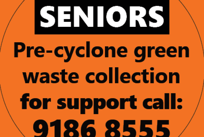 If you are a senior or would like to organise pre-cyclone green waste cleanup-up for a senior please call 08 9186 8555 or apply online. The City will organise a contractor to ensure your house and yard are ready for cyclone season.