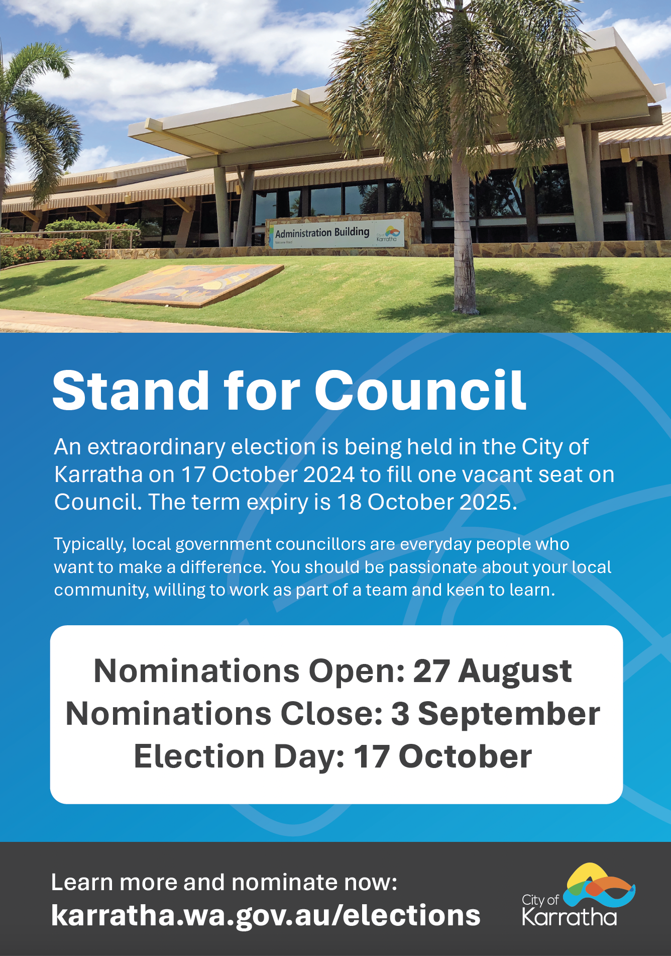 For more information on the election process, visit Local Government Extraordinary Election Call For Nominations | City of Karratha